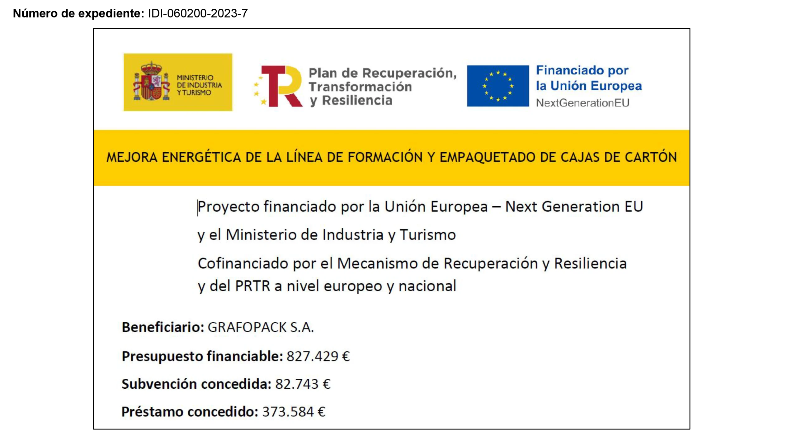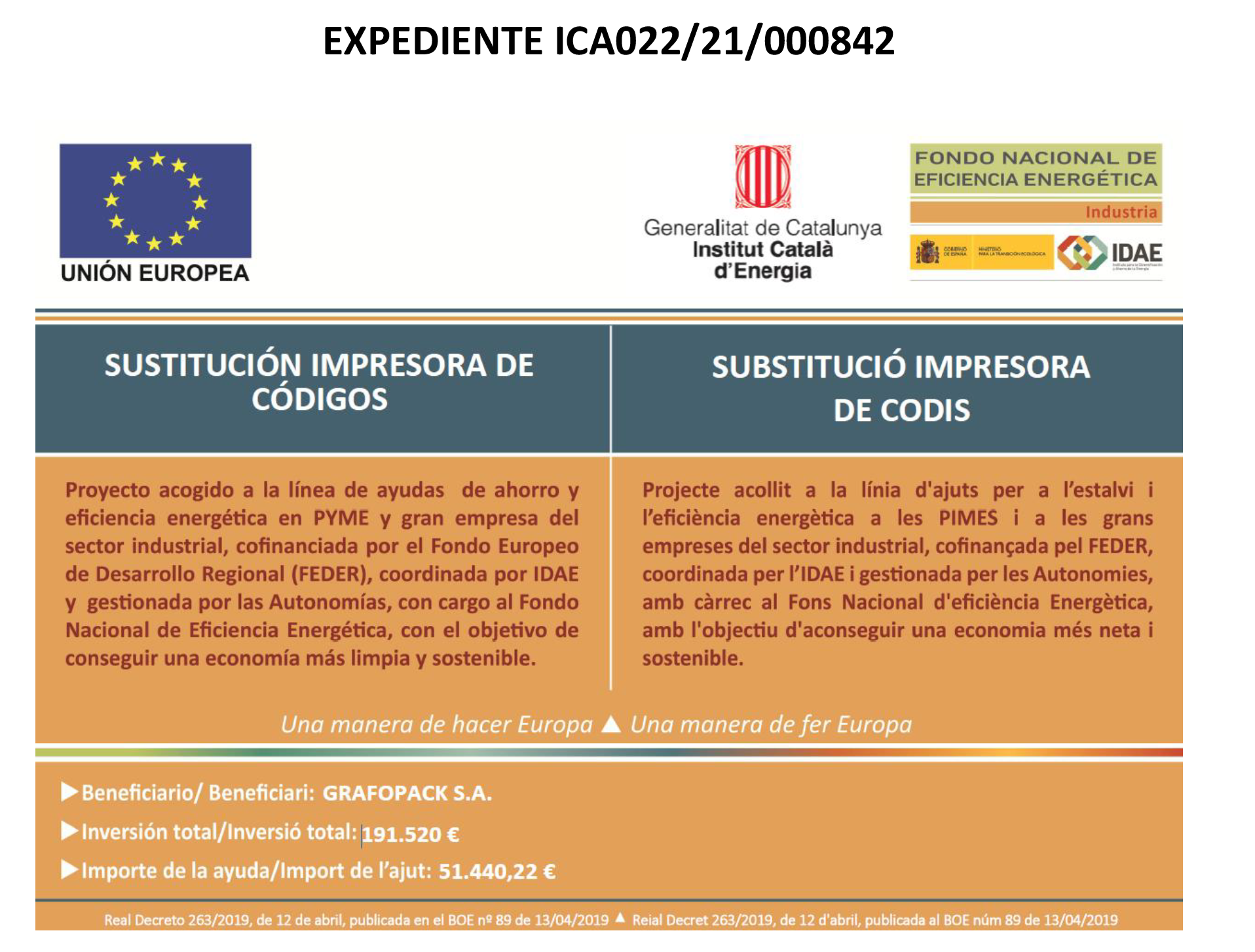GRAFOPACK S.A. a reçu une subvention pour son projet d’économie d’énergie et d’efficacité énergétique Amélioration de l’isolation thermique des installations de production, cofinancé par le Fonds européen de développement régional (FEDER), coordonné par l’IDAE et géré par les régions autonomes, dans le cadre du Fonds national pour l’efficacité énergétique, dans le but de parvenir à une économie plus propre et plus durable. Un projet d’économie d’énergie et d’efficacité énergétique a été élaboré, consistant à remplacer les fenêtres et la chaudière. Il a nécessité la collaboration des meilleurs équipementiers du secteur, qui nous permettront de réaliser d’importantes économies d’énergie et d’environnement. Grâce à ce projet, 6,34 tonnes par an seront économisées.