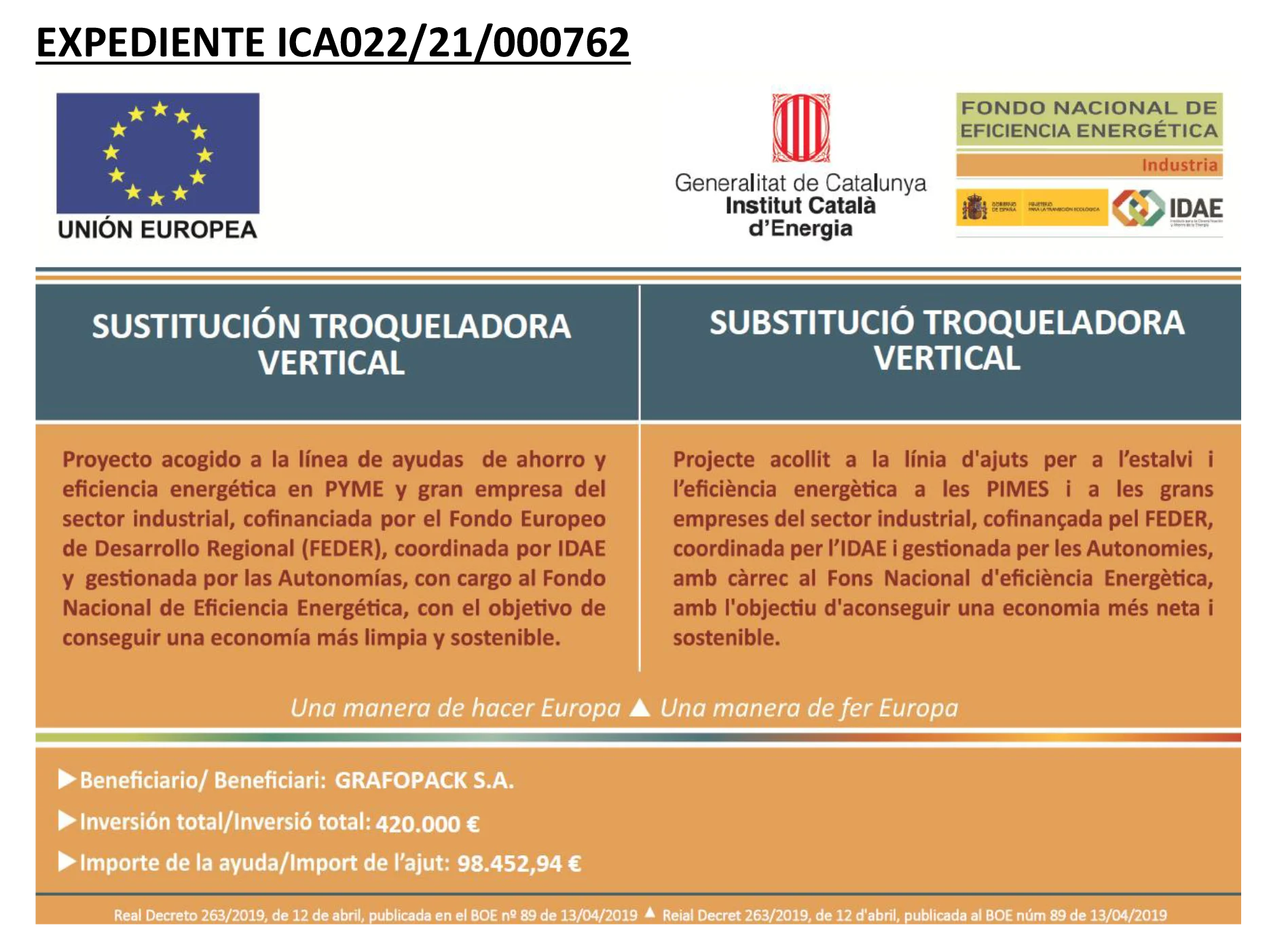 GRAFOPACK S.A. ha recibido una ayuda para su proyecto de ahorro y eficiencia energética, cofinanciada por el Fondo Europeo de Desarrollo Regional (FEDER), coordinada por IDAE y gestionada por las autonomías, con cargo al Fondo Nacional de Eficiencia Energética, con el objetivo de conseguir una economía más limpia y sostenible. Se ha elaborado un proyecto de ahorro y eficiencia energética que consiste en la sustitución de una troqueladora vertical de cajas por una nueva con tecnología mejorada. Se ha requerido la colaboración de los mejores fabricantes de equipamiento del sector, que nos aportarán grandes ahorros energéticos y medioambientales en el proceso. Gracias al proyecto se ahorran 29,60 teps anuales.